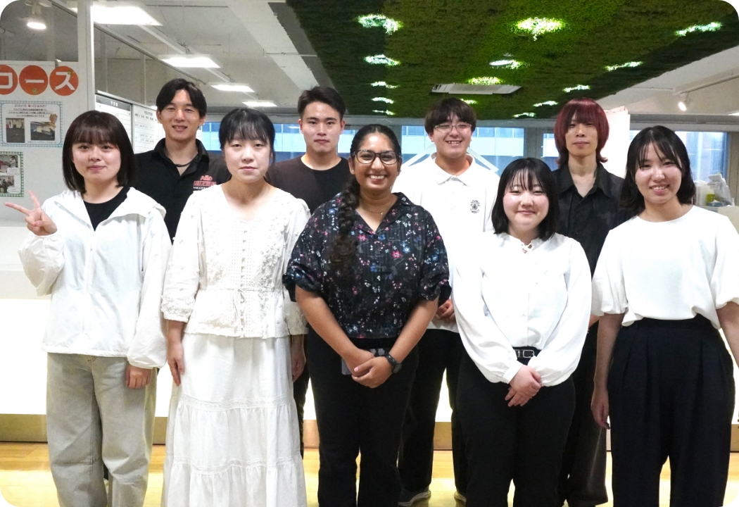 2025年度夏期のインターン生たち。中国、スリランカからの留学生含め、9人の大学生・大学院生がインターンシップに参加していただきました。