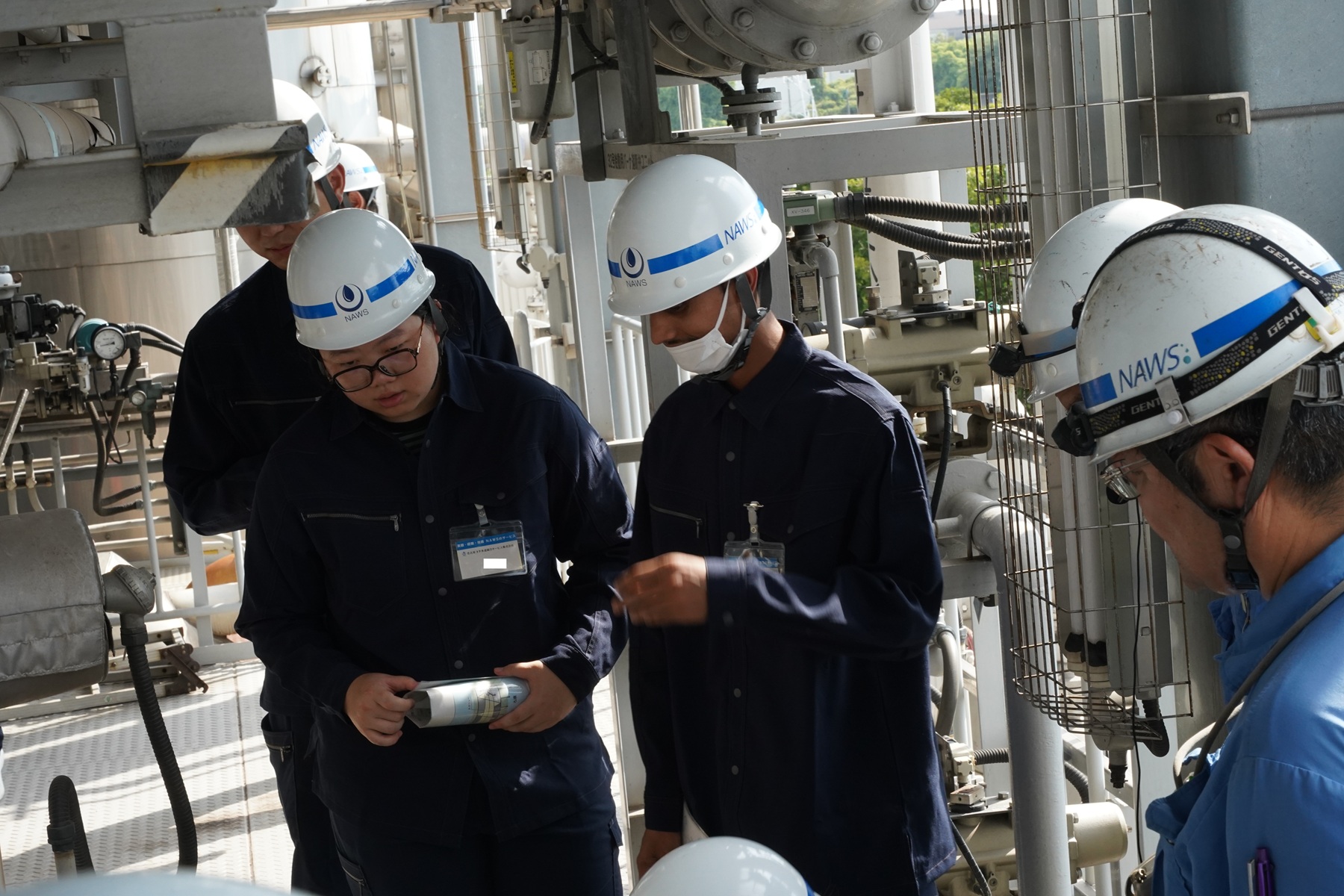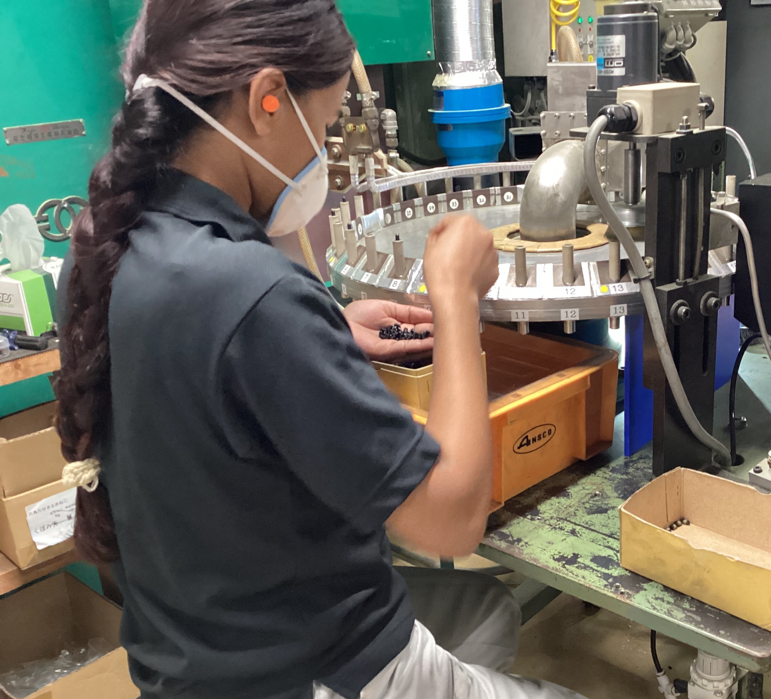 2025年度夏季のインターンシップにネパール・中国出身の留学生に参加いただきました。ゆるみ止め加工工程にて、機械へのネジのセッティング作業を体験しているところ。細かく緊張感を伴う作業も落ち着いて進めていました。