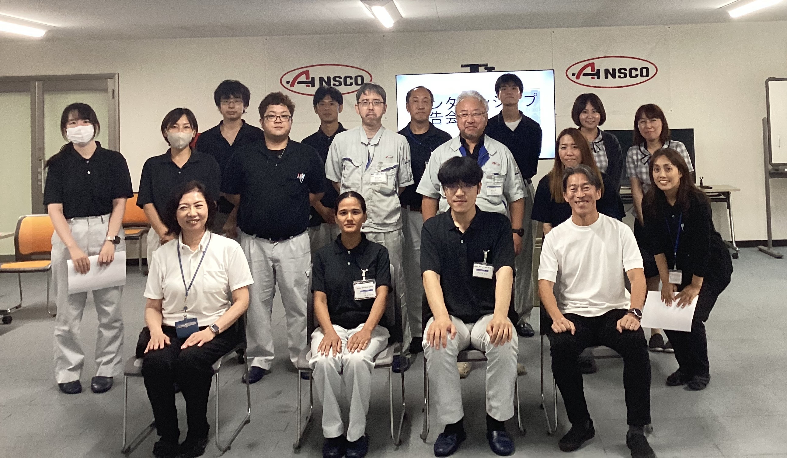 インターンシップ最終日に成果発表会を滞りなく実施。短期間ながら質の高い報告が行われ、参加従業員からも笑顔と好意的な反応が見られました。最後に記念写真を撮影。