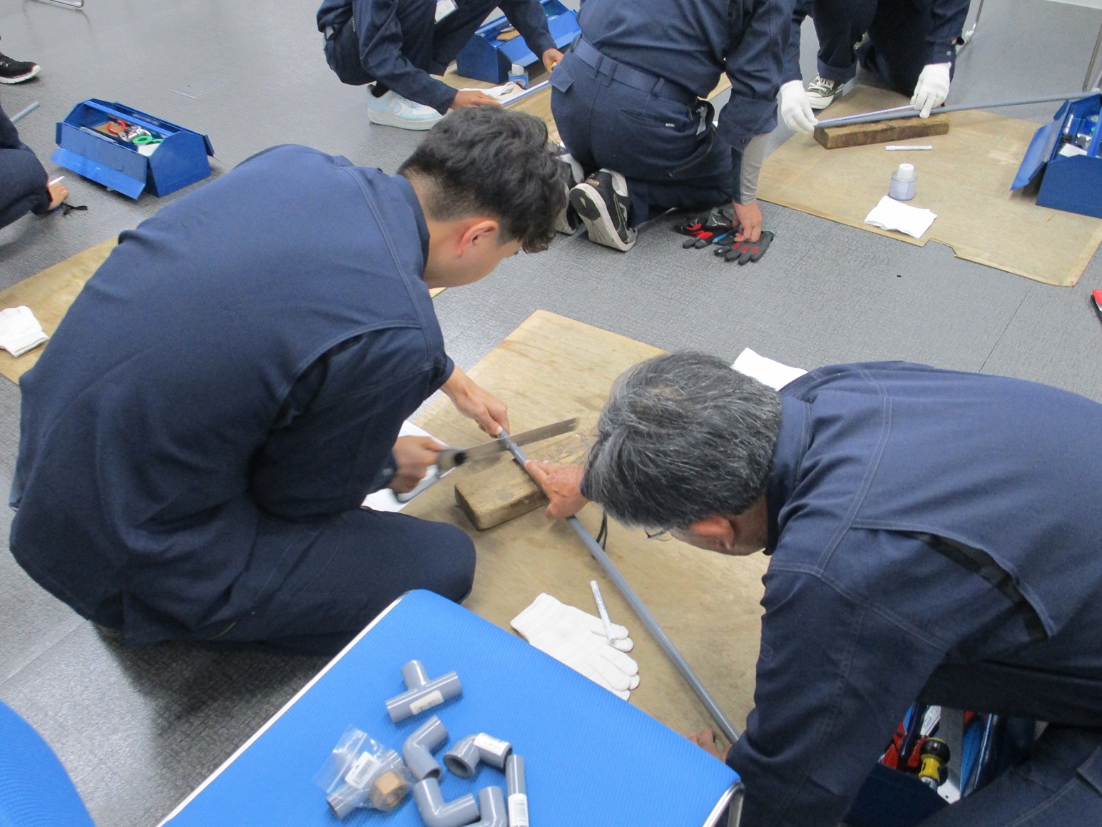 社長が直接留学生にクレーンの操縦方法について説明している風景です。 留学生は「難しいです」と言いながら、真剣に操作に取り組んでいました。